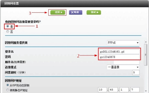 选择菜单“基本”——>“因特网设置”——>“您的因特网连接需要登录吗”选择:否——>“因特网IP地址”选择:使用静态IP地址;然后填写:宽带运营商提供的IP地址、IP子网掩码、网关IP地址——>“域名服务器(DNS)地址”选择:使用下面的DNS服务器;然后填写宽带运营商提供的DNS服务器地址——>点击“应用”如下图: